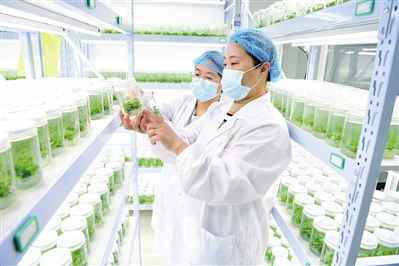 日前,在建德市新安种业有限公司的草莓智能培育温室里,技术人员在25℃的温度下,正在认真察看玻璃瓶内无菌草莓植株的长势。今年以来,该公司通过对红颜、建德红等14个草莓品种的培育炼苗,每年可为农户提供15万株优质原种苗作为草莓生产苗,助农增产增收。
