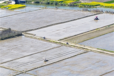 3月20日,春分节气,余姚市农民抢抓农时开展春耕生产。图为该市黄家埠镇上塘村农民正驾驶农机平整水田。张辉 摄