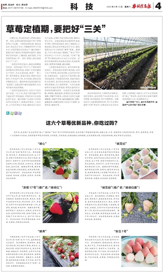 近年来,我省推广自主选育的“越心”“建德红”“粉玉”等6个草莓优新品种,在省内推广种植面积超30%,辐射上海、江苏、安徽等长三角地区及北京、贵州、陕西等地,年推广应用面积3万余亩,实现草莓早中晚不同熟期、不同果色、不同用途(采摘或储运)品种搭配,拉长草莓供应期,丰富品种结构,满足市场多元化需求。