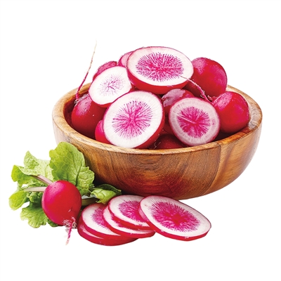 红心萝卜,水分多,口感偏甜,生吃清脆爽口。每100克红心萝卜热量为41千卡,是不可多得的低热量食物。每100克维生素C含量高达20毫克、胡萝卜素高达80微克、钾含量高达385毫克,充足的钾摄入对控制血压有帮助。它还含有丰富的花青素,瓤越红,花青素含量越高,能延缓衰老,减缓慢性非传染性疾病(如糖尿病、心脑血管疾病等)进展。其含有的淀粉酶、脂肪酶和芥子油,对帮助消化、促进胃肠蠕动有一定作用。